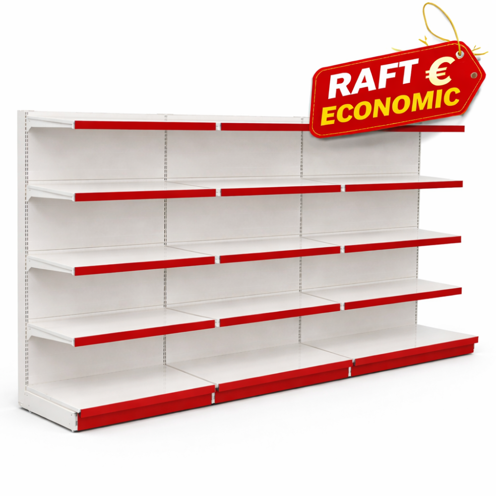 Modulul de 3 de rafturi metalice economice pentru magazin, cu înălțime de 220 cm și finisaj alb cu margine frontală roșie, este o soluție practică și accesibilă pentru amenajarea spațiilor comerciale. Acest tip de raft metalic pentru magazin este ideal pentru magazine alimentare, magazine mixte, minimarketuri, drogherii sau alte spații retail care au nevoie de o organizare eficientă a produselor.