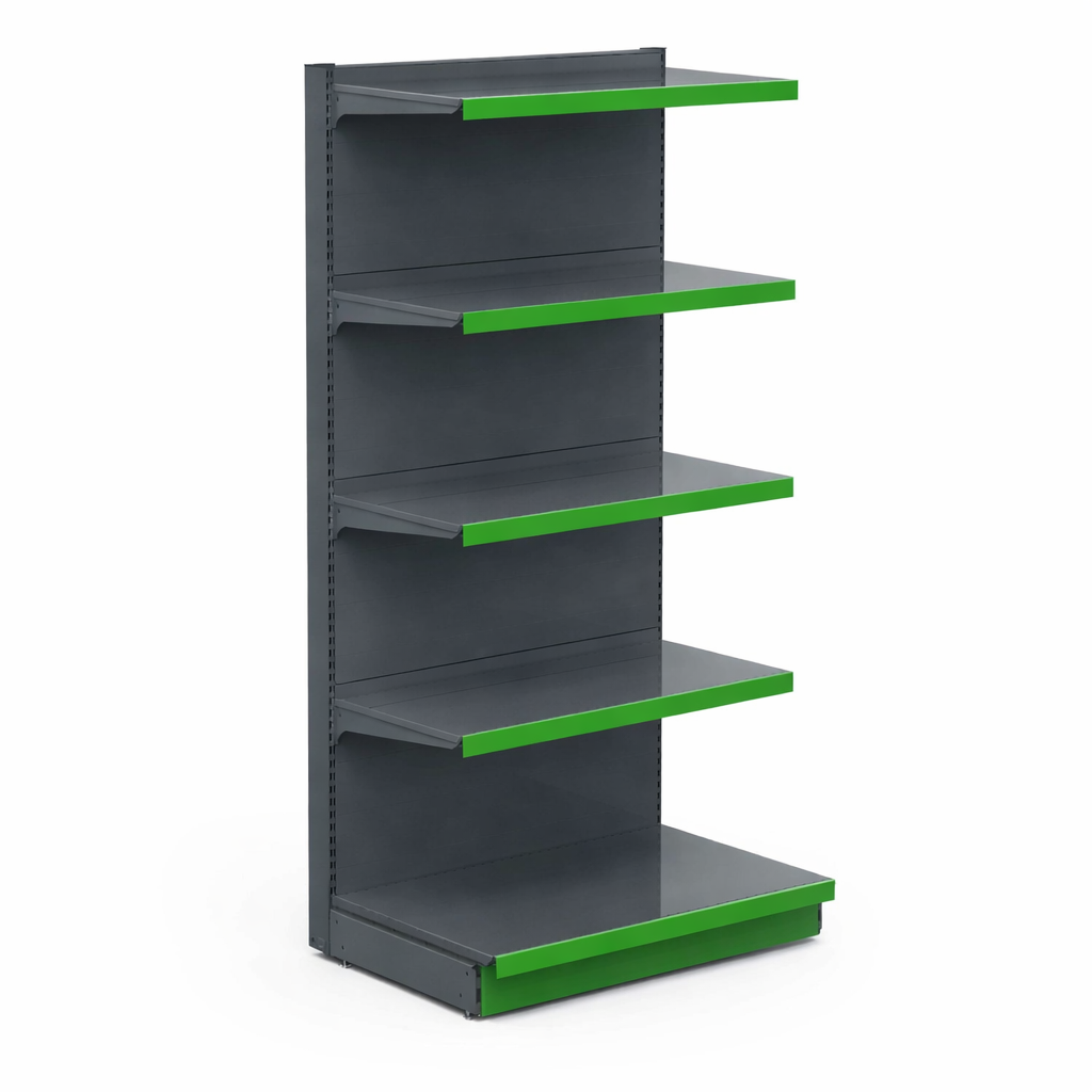 Modelul este prevăzut cu bază solidă și 4 polițe metalice reglabile, care permit ajustarea înălțimii în funcție de tipul produselor expuse. Designul vertical maximizează spațiul din magazin și facilitează accesul rapid al clienților la produse. Marginea frontală verde este ideală pentru montarea etichetelor de preț, fiind foarte utilă în magazinele cu vânzare directă.
