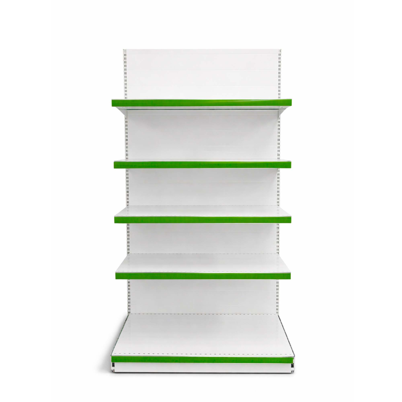 Structura este finisată în alb, ceea ce oferă un aspect curat și luminos, iar marginile frontale ale polițelor sunt accentuate cu bandă verde, asigurând o bună vizibilitate a produselor și un design atractiv. Raftul este prevăzut cu 5 niveluri de expunere, inclusiv polița de bază, permițând organizarea eficientă a mărfurilor de diferite dimensiuni.